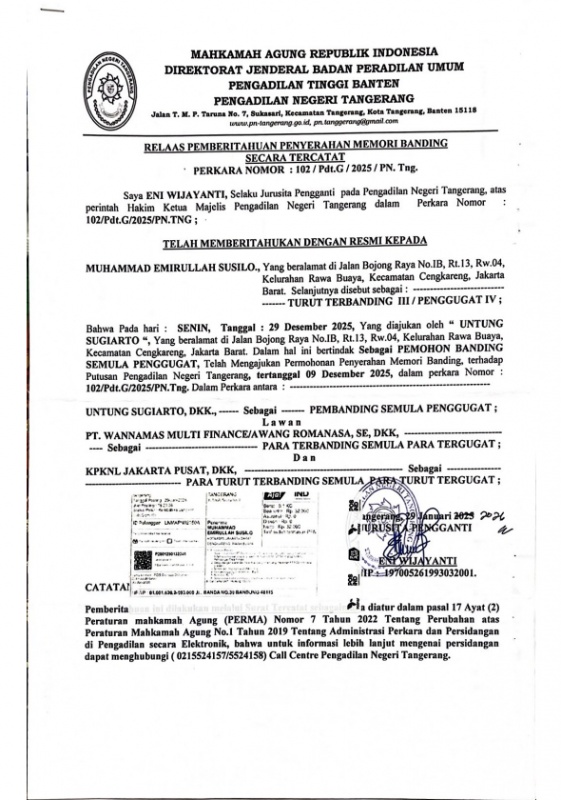 RELAAS PEMBERITAHUAN PENYERAHAN MEMORI BANDING PERKARA NOMOR : 102/PDT.G/2025/PN. TNG (MUHAMMAD EMIRULLAH SUSILO)